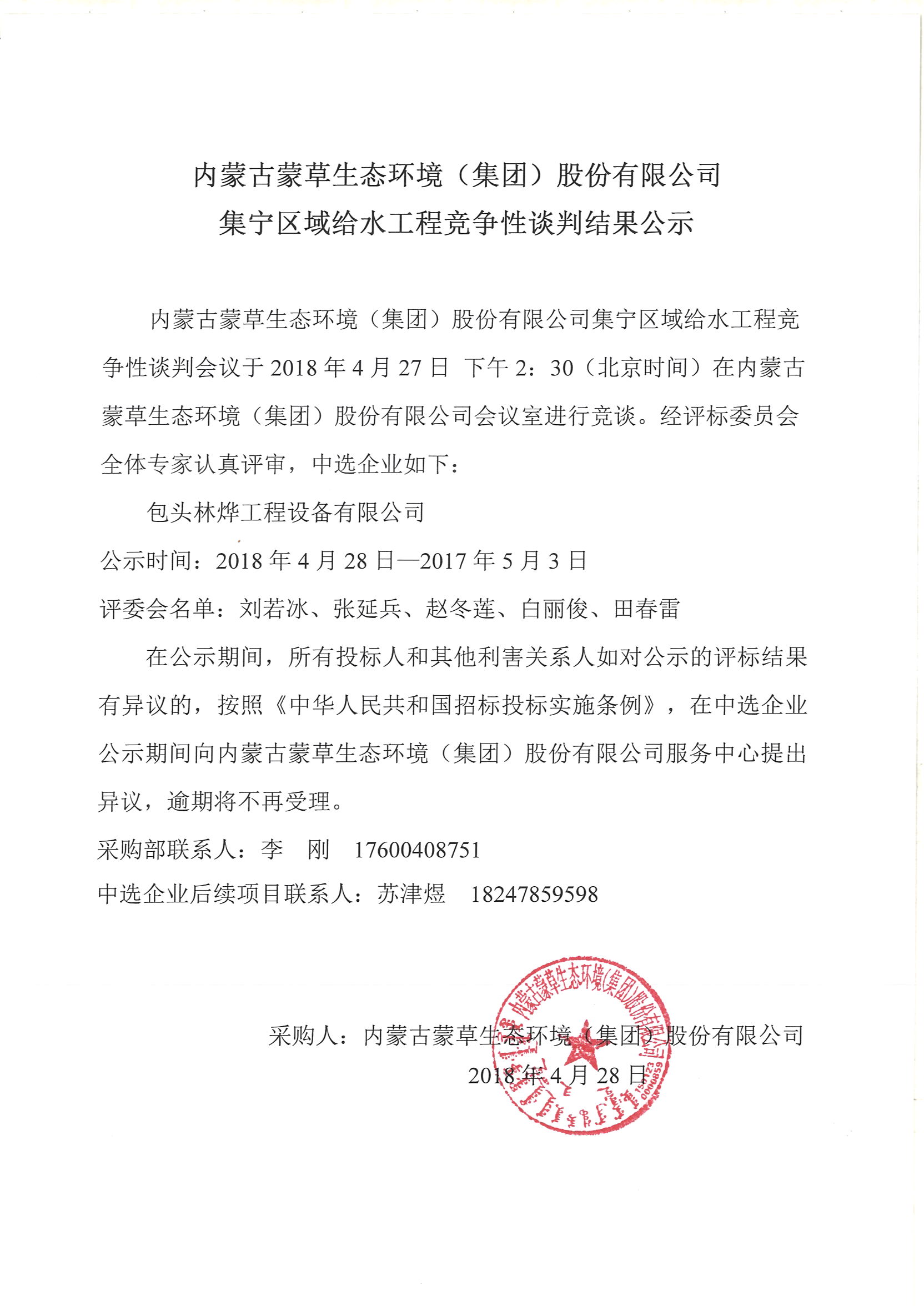 內(nèi)蒙古蒙草生態(tài)環(huán)境(集團(tuán))股份有限公司集寧區(qū)域給水工程競(jìng)爭(zhēng)性談判會(huì)議于2018年4月27日 下午2:30(北京時(shí)間)在內(nèi)蒙古蒙草生態(tài)環(huán)境(集團(tuán))股份有限公司會(huì)議室進(jìn)行競(jìng)談。經(jīng)評(píng)標(biāo)委員會(huì)全體專家認(rèn)真評(píng)審,中選企業(yè)如下:
