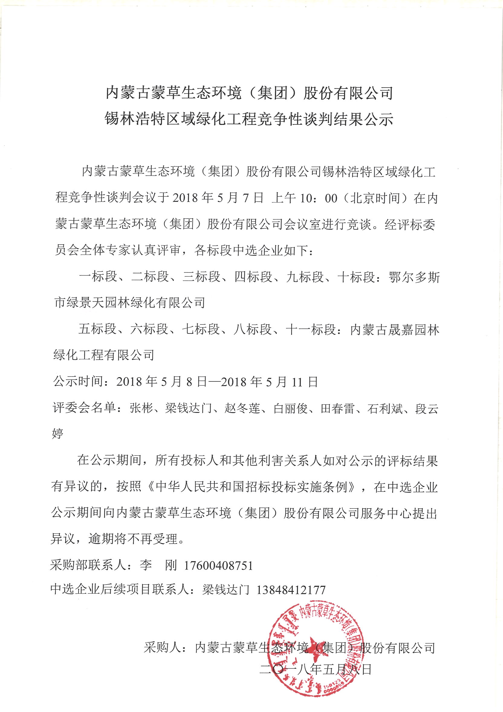 內(nèi)蒙古蒙草生態(tài)環(huán)境(集團(tuán))股份有限公司錫林浩特區(qū)域綠化工程競(jìng)爭(zhēng)性談判會(huì)議于2018年5月7日 上午10:00(北京時(shí)間)在內(nèi)蒙古蒙草生態(tài)環(huán)境(集團(tuán))股份有限公司會(huì)議室進(jìn)行競(jìng)談。經(jīng)評(píng)標(biāo)委員會(huì)全體專家認(rèn)真評(píng)審,各標(biāo)段中選企業(yè)如下: