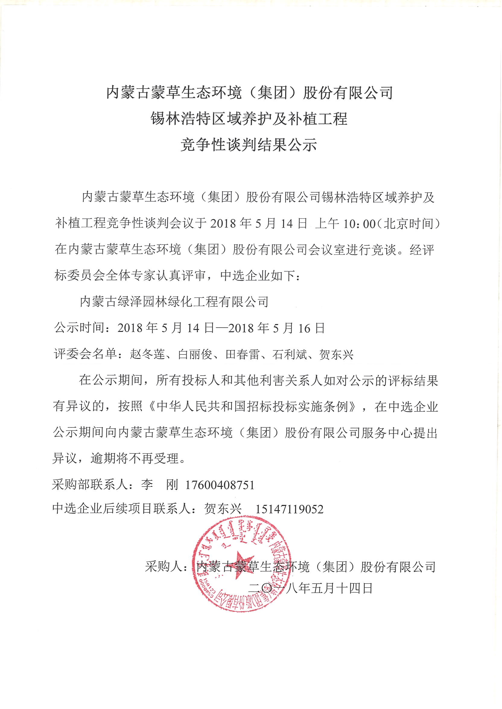 內(nèi)蒙古蒙草生態(tài)環(huán)境(集團(tuán))股份有限公司錫林浩特區(qū)域養(yǎng)護(hù)及補(bǔ)植工程競(jìng)爭(zhēng)性談判會(huì)議于2018年5月14日 上午10:00(北京時(shí)間)在內(nèi)蒙古蒙草生態(tài)環(huán)境(集團(tuán))股份有限公司會(huì)議室進(jìn)行競(jìng)談。經(jīng)評(píng)標(biāo)委員會(huì)全體專家認(rèn)真評(píng)審,中選企業(yè)如下: