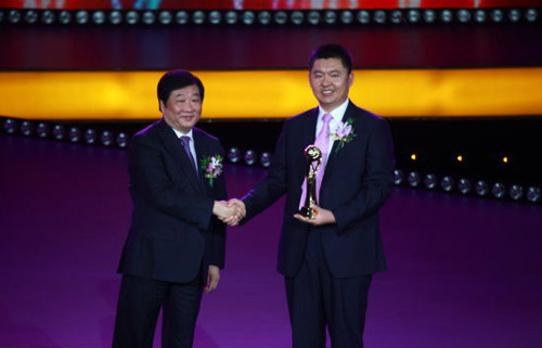 圖為濰柴動(dòng)力股份有限公司董事長(zhǎng)譚旭光(左)為獲獎(jiǎng)?wù)咄跽倜飨壬ㄓ遥╊C獎(jiǎng)