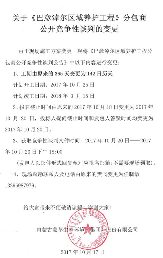 關(guān)于《巴彥淖爾區(qū)域養(yǎng)護(hù)工程》分包商 公開競爭性談判的變更