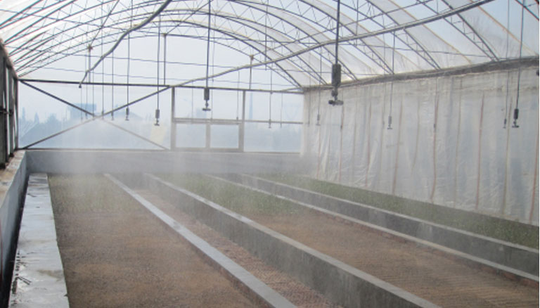 前不久,扦插苗床在抗旱植物研究院正式落成。該苗床位于連棟溫室西南角,占地面積90平方米,內(nèi)置3個(gè)獨(dú)立苗床,為全光照噴霧扦插苗床,